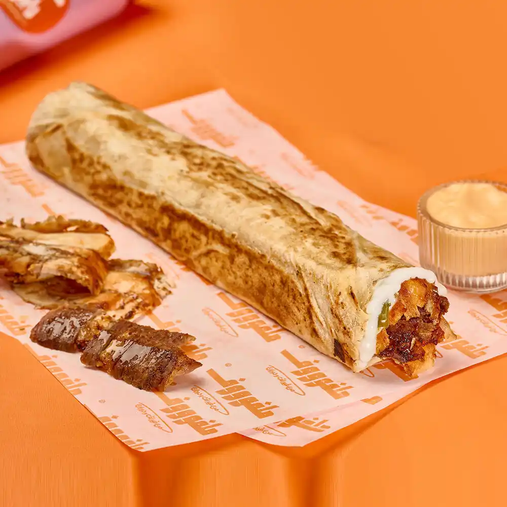 شاورما تندوري - بطاطس - شيش تندوري - هالبينو - جبنة موزاريلا - تومية حار
